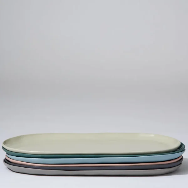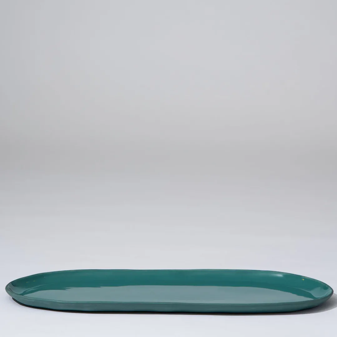 Hand cast ceramic plate with a subtle irregular shape.36 x 17 x 1.5cm